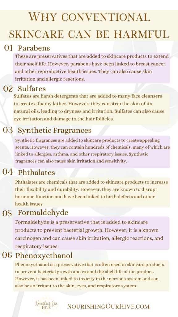 - Parabens: These are preservatives that are added to skincare products to extend their shelf life. However, parabens have been linked to breast cancer and other reproductive health issues. They can also cause skin irritation and allergic reactions.